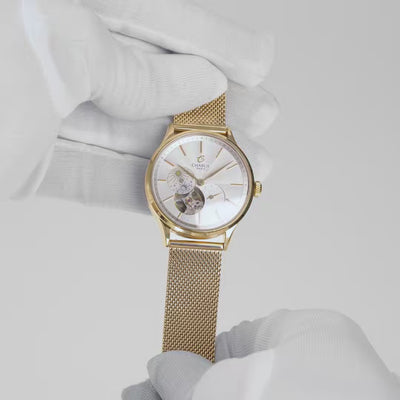 Imaginée et assemblée en France, l’Initial 36 Cœur Ouvert Jour/Nuit allie lignes épurées et équilibre subtil entre style classique et modernité. Son design met en valeur la complication jour/nuit, véritable jeu de lumière qui accompagne le rythme du temps. Avec son boîtier doré rose de 36 mm, son mécanisme apparent et ses bracelets interchangeables, cette montre automatique pour femme est pensée pour traverser les années avec élégance.
